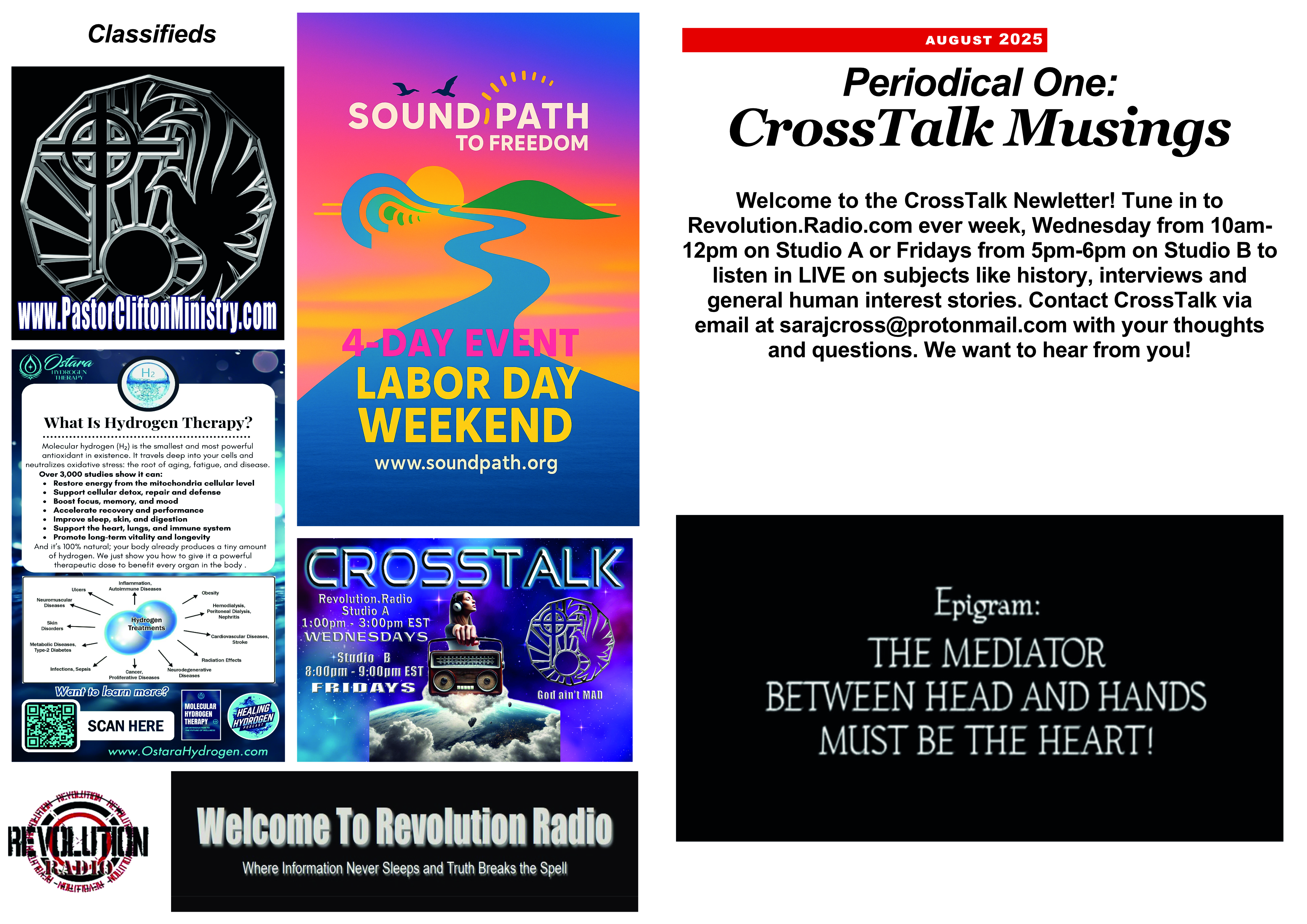 Welcome to the CrossTalk Newletter! Download for FREE! Tune in to Revolution Radio (https://revolution.radio/) every week, Wednesday from 10am-12pm PST on Studio A or Fridays from 5pm-6pm PST on Studio B to listen in LIVE on subjects like history, interviews and general human interest stories. Contact CrossTalk via email at This email address is being protected from spambots. You need JavaScript enabled to view it. with your thoughts and questions. We want to hear from you!